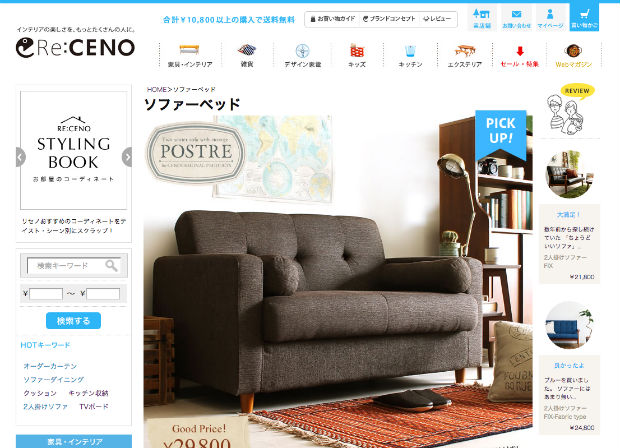 おしゃれで購入しやすい価格の家具・インテリアグッズを販売している通販サイト、Re:CENO(リセノ)。大容量の収納付きソファベッド「POSTRE」は、おしゃれで価格も手頃です。PVCレザーを使用したモダンなデザインのソファベッドも販売しています。各商品ページには、詳細な説明と写真が掲載されているので、ソファベッドを探している場合はぜひチェックしておきたい通販ショップです。